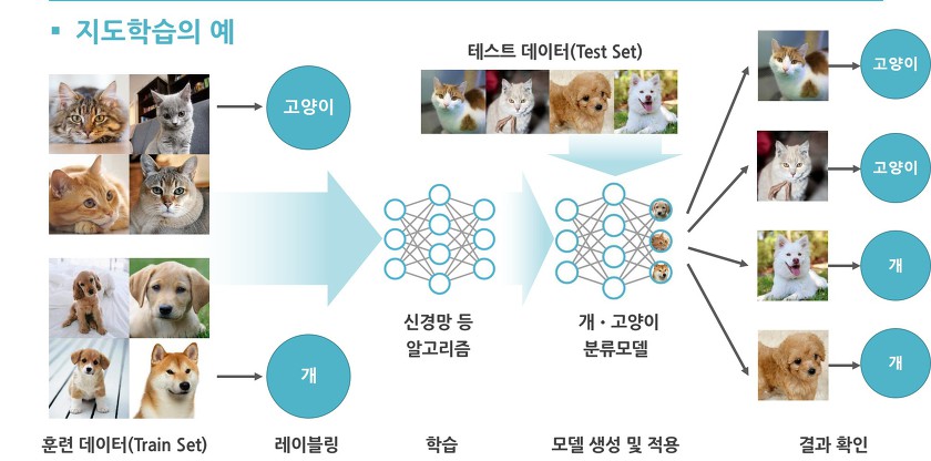 지도학습의 예시를 들어보면 여러 장의 사진을 주고 개와 고양이 사진을 구분하라고 시키는 것. 이 때 어떤 것이 고양이 사진인지, 개 사진인지 답을 알려준다. 이렇게 학습하도록 주는 데이터를 훈련 데이터(Train Set)이라고 하고, 훈련 데이터에 답지를 달아주는 것을 레이블링(Labeling)이라고 한다.
