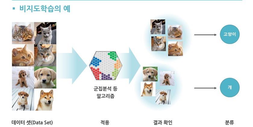 앞과 동일하게 개와 고양이 사진 구분을 목적으로 사진들을 입력하는 상황에서 비지도학습은 어느 사진이 개인지 고양이인지 알려주지 않는다.(즉 레이블링 하지 않는다.)