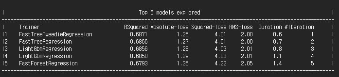 학습을 하면 위 와같이 출력콘솔창에 각 모델에 대한 RSquared 값과 결과치들이 나온다. 이중 RSquared가 가장 높은 값이 모델로 선택이 된다. RSquared 값의 범위는 0과 1 사이이고, 가능한 최고의 값은 1이다. 즉, RSquared의 값이 1에 가까울수록 모델의 성능이 향상된다. 점수가 좋지 않으면 더 긴 시간 동안 학습하거나 더 많은 데이터를 추가하거나 데이터의 균형을 유지해야한다. 데이터의 균형을 유지하는 건 빈값이 없도록 하는 것이 좋다.