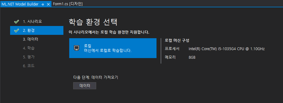 값 예측 시나리오는 로컬ML이라고 되어 있다. 학습을 로컬에서 진행한다는 뜻이다. 로컬컴퓨터의 자원이 좋아야 학습속도가 빨라진다.