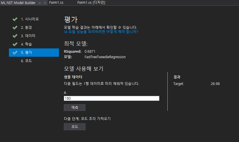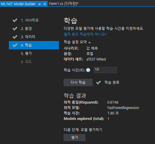 학습결과 최적 품질(RSquared)이 0.6748이 나왔다.