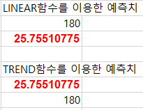 엑셀을 이용하여 함수를 이용한 회귀분석 예측값과 비교해보면 차이가 좀 난다. 엑셀 분석보다 조금 더 정확하다.