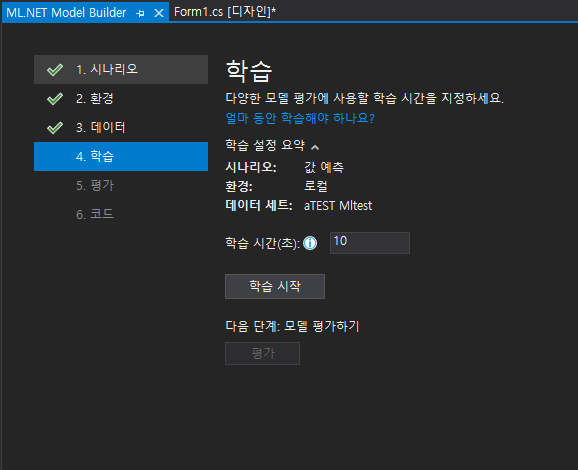 열들을 결정한 후 학습을 누르면 학습시간이 나온다.