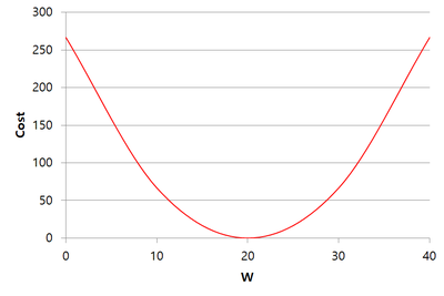 Cost function을 Cost와 W에 대해서 그래프로 그린다면, 아래와 같이 그려진다.(W에 0, 10, 20, 30 대입해서 직접 그려본다.)