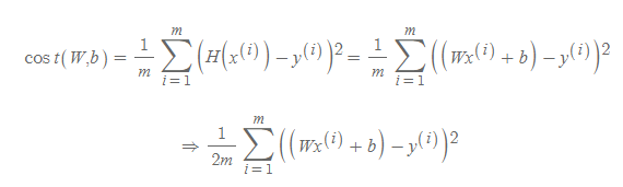 Cost function에서 기울기를 구하려면 미분을 해야 하므로 편의상 분모에 2를 곱해주었다. 1/m에서 최소화하나 1/2m에서 최소화하나 어차피 같은 결과가 나오므로 계산상 편하게 하기 위해 분모에 2를 곱해주었다.