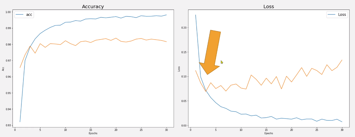 learnaday 출처 파란선이 학습그래프이고 주황색이 검증그래프이다.