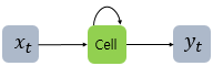 이를 그림으로 표현하면 위와 같습니다. xx는 입력층의 입력 벡터, yy는 출력층의 출력 벡터입니다. 실제로는 편향 bb도 입력으로 존재할 수 있지만 앞으로의 그림에서는 생략합니다. RNN에서 은닉층에서 활성화 함수를 통해 결과를 내보내는 역할을 하는 노드를 셀(cell)이라고 합니다. 이 셀은 이전의 값을 기억하려고 하는 일종의 메모리 역할을 수행하므로 이를 메모리 셀 또는 RNN 셀이라고 표현합니다.