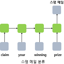 또한 단어 시퀀스에 대해서 하나의 출력(many-to-one)을 하는 모델은 입력 문서가 긍정적인지 부정적인지를 판별하는 감성 분류(sentiment classification), 또는 메일이 정상 메일인지 스팸 메일인지 판별하는 스팸 메일 분류(spam detection)에 사용할 수 있습니다. 위 그림은 RNN으로 스팸 메일을 분류할 때의 아키텍처를 보여줍니다. 이러한 예제들은 11챕터에서 배우는 텍스트 분류에서 배웁니다.